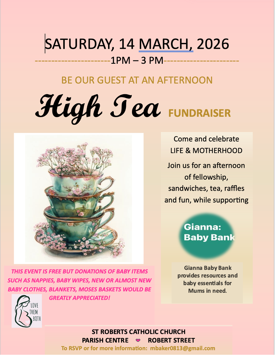 Celebrate Life and Motherhood with an Afternoon Tea to benefit the Gianna Baby Bank on Saturday, March 14th from 1-3 p.m. in the parish centre. This event is FREE but we are kindly asking everyone to bring an item to donate to the Baby Bank such as nappies, baby wipes, new or gently used baby clothes, blankets, prams, Moses baskets, etc... The Gianna Baby Bank is an affiliate of Catholic Care who provide free resources and baby essentials to Mums in need. All donations are greatly appreciated. There will be a raffle and free door prizes for those attending. If you would like to attend, please sign the sign-up sheet in the Narthex for catering purposes. We do hope you will join us in support of this most worthy cause.