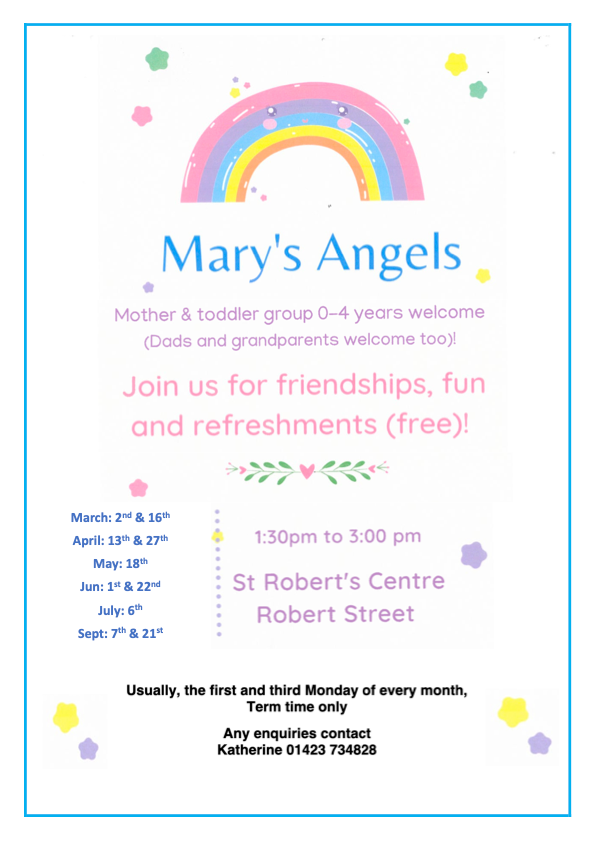 Mary’s Angels parent and baby/toddler group - 1st and 3rd Monday afternoons 1.30-3pm